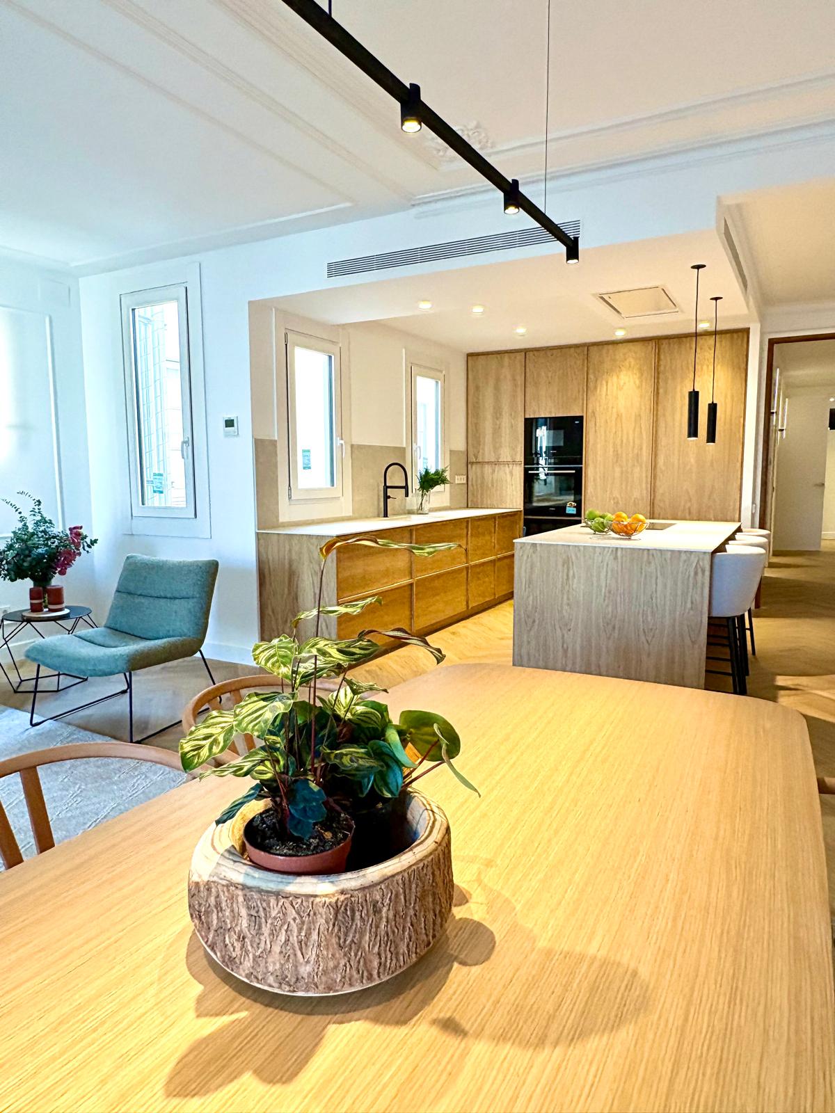 Hem creat una zona diàfana que connecta cuina, menjador i sala, potenciant l’amplitud i la llum. Els tons neutres, el mobiliari a mida i la il·luminació ambiental aporten calidesa, confort i un estil modern i acollidor.